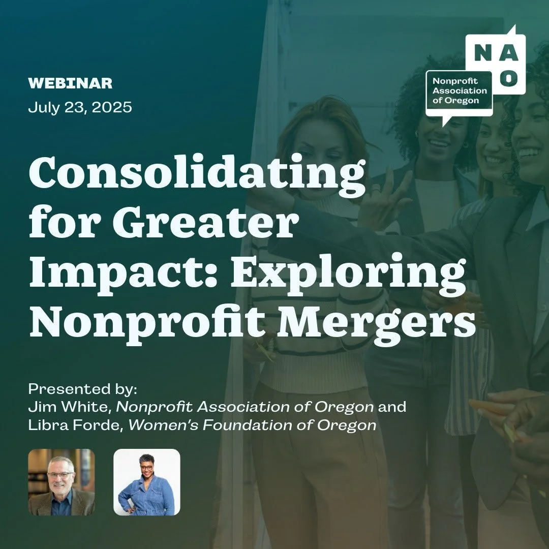 If your nonprofit is considering or exploring a potential merger, join our free 90-minute webinar, "Consolidating for Greater Impact: Exploring Nonprofit Mergers." Executive Directors Jim White (NAO) and Libra Forde (Women's Foundation of Oregon) will discuss the key factors behind consolidation and provide guidance on transitioning from discussions to achieving crucial alignment in finances, legal matters, governance, and organizational culture.